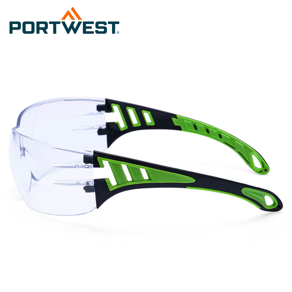 Innovative lightweight dielectric safety spectacles with metal free hinges, featuring a tough and modern design with dual material on the side arms. Side holes offer increased ventilation for optimum comfort.